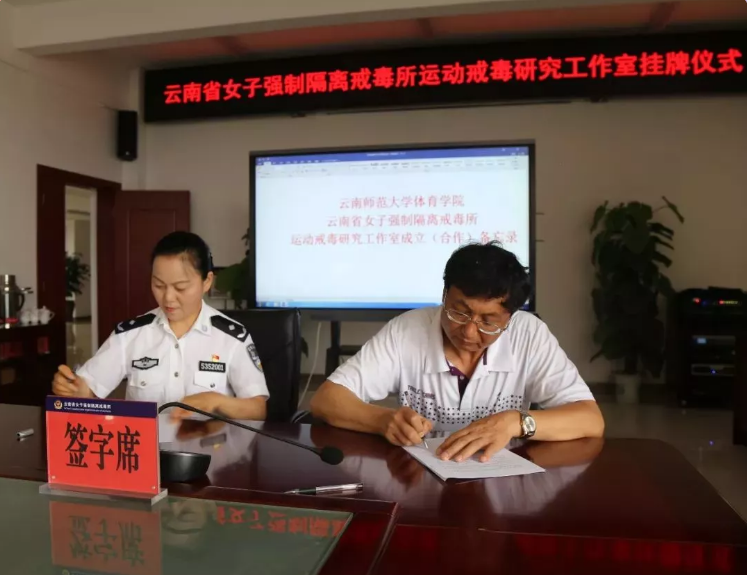 仪式上,省女所党委书记、所长魏凤玲与我校体育学院孙振武院长签订合作备忘录,并为“运动戒毒研究工作室”揭牌。