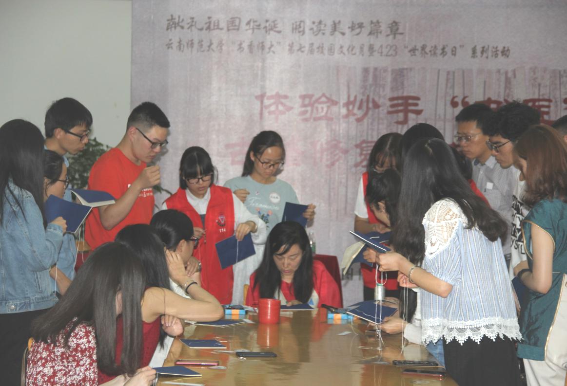 6月6日下午,在2019“文化和自然遗产日”来临之际,图书馆联合云南省图书馆(云南省古籍保护中心),在图书馆南楼102室成功举办 “体验妙手‘书医’——古籍修复技艺进校园”活动,为到场师生带来了一场零距离接触“非遗”传统技艺的盛宴。云南省古籍保护中心修复专家计思诚、颜艳萍、杨敏仙、施济颖、郭、刘洁,图书馆副馆长王顺英、傅宇斌,以及各学院报名参与活动者、图书馆工作人员、学生馆员等共70余人参加了此次活动。活动由图书馆古籍特藏部主任侯宇亮主持。