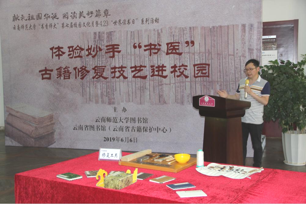 图书馆副馆长傅宇斌为活动致辞。傅老师向大家简要介绍了云南省图书馆古籍保护与修复工作的概况,作为西部地区唯一的国家级古籍修复中心,省图书馆致力于古籍文献的保护,尤其重视对少数民族古籍文献的抢救保护,2014-2018年,抢救性修复纳格拉洞藏经2285叶。傅老师还简述了我校图书馆古籍馆藏与保护工作情况,并希望大家通过本次活动,更多地了解古籍,接触传统文化、传统技艺,身体力行地去保护传统、传承文化。