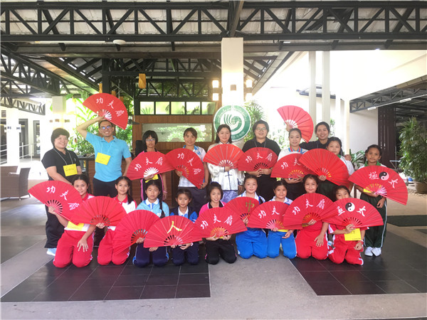 在下午的文化活动中,清迈孔院的教师承担了中国舞展示、书法教学、功夫扇教学三个部分。在书法学习中,同学们先学习使用了文房四宝,接着练习了汉字笔画点、横、竖、撇、捺,以及“永”、“福”、“平”、“安”等汉字。中国舞的教学则是从讲解中国舞的分类、动作内涵以及中泰舞蹈之间的联系开始,之后分步骤学习了舞蹈动作。同学们穿着汉服练习动作,激动的心情溢于言表,互相拍照,并争相和孔院老师合影。最特别的是在室外进行的功夫扇教学,孔院教师先向同学们讲解了中国武术的礼仪,再依次讲解了功夫扇的动作。刚开始学开扇的时候,有些同学掌握不住动作要领,扇子掉在了地上,经过老师细心认真的指导,最后大家都完成了所学动作,整齐的进行了一套功夫扇表演。