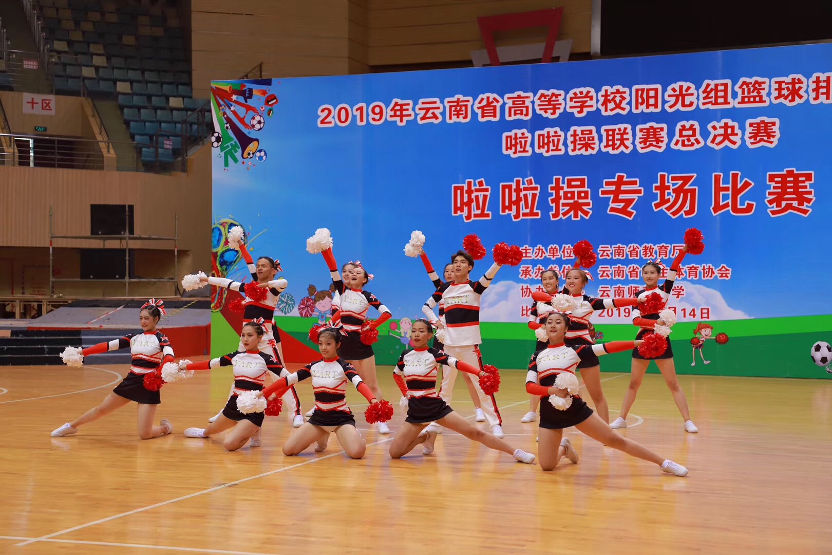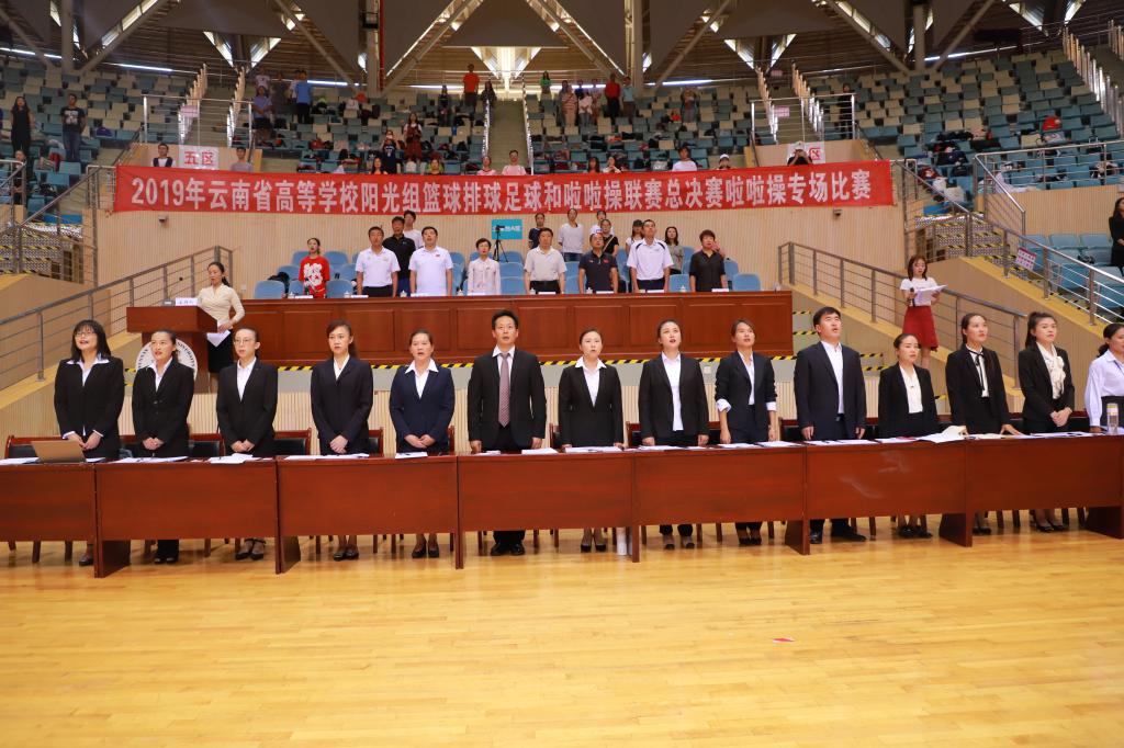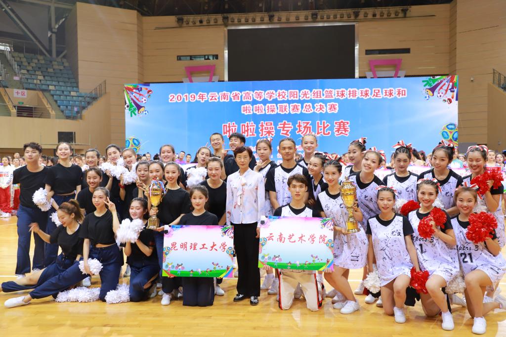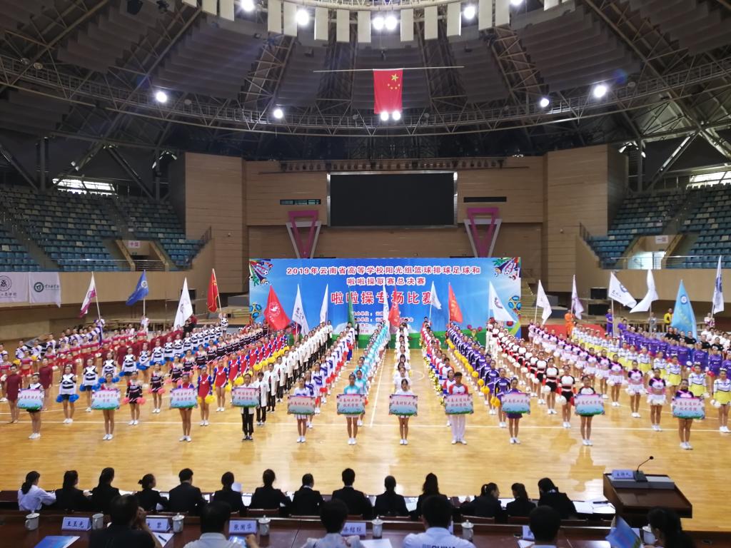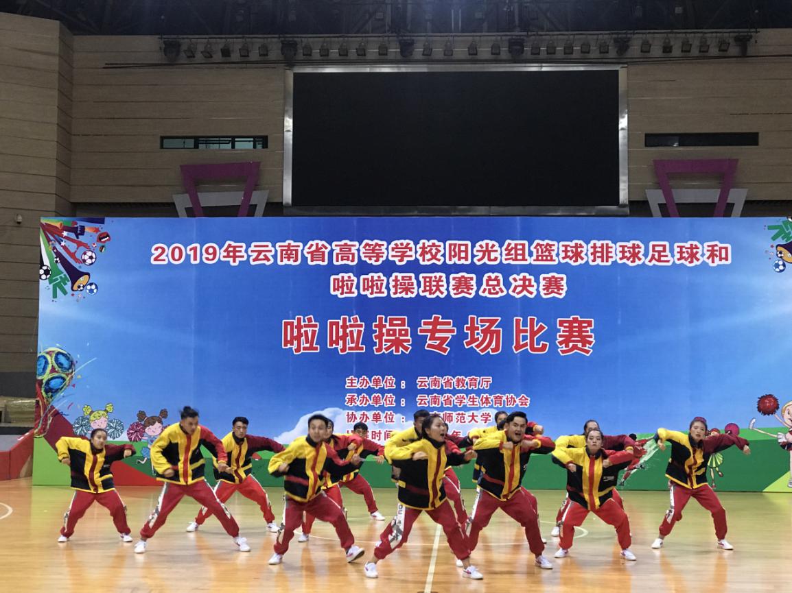 由云南省教育厅主办,云南省学生体育协会承办,云南师范大学协办的“2019年云南省高等学校阳光组篮球排球足球和啦啦操联赛”于6月14日在我校呈贡主校区莲花体育馆举行最后的啦啦操专场比赛。