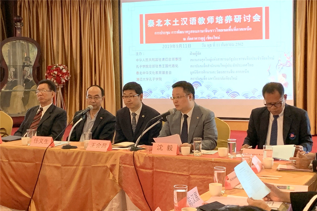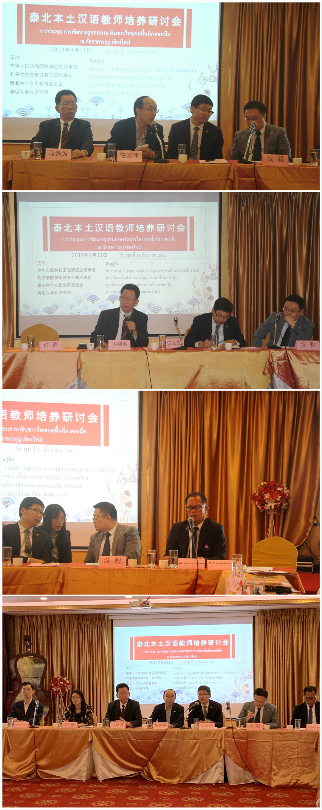 911日,泰北本土汉语教师培养研讨会在清迈成功举行。本次研讨会由中华人民共和国驻清迈总领事馆、孔子学院总部驻泰王国代表处、泰北中华文化教育基金会和清迈大学孔子学院联合主办。中华人民共和国驻清迈总领事馆任义生总领事、孔子学院总部驻泰王国代表处王会昌处长、泰北中华文化教育基金会马剑波主席、清迈大学孔子学院中泰方院长、泰国教育部基教委新任办公室主任伯乐先生(Mr. Boonlert Konsard)、泰国教育部基教委高级项目官员狄恩先生(Mr.Trin Kandokmai)、泰国教育部民教委特别政策处处长克林改·希拉伦斯利先生(Mr.Kriengkrai Silarungsri)及汉语项目顾问黄淑环女士(Mrs.Sukanit Piyavittayanon)、清迈教育局代表、泰北华文民校联谊会代表、清迈大学代表、泰北地区汉语示范中心学校代表及媒体代表共50余人出席了研讨会。研讨会由清迈孔院中方院长沈毅主持。