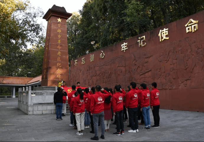 在革命老区纪念碑前,组织员(兼研究生党支部书记)段灿映同志带领研究生党员,面向鲜红的党旗重温了入党誓词。
