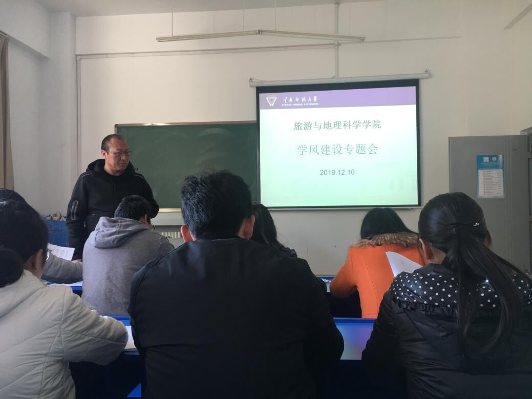 为了进一步加强学风建设,做好全国英语三四六级及期末考试工作,帮助同学们掌握良好的学习方法,更好地学习专业知识,旅游与地理科学学院于2019年12月10日下午在学院220召开了学风建设专题会,参加本次会议的有全体班主任、辅导员老师、学院教务办老师及院党委副书记白宇老师。
