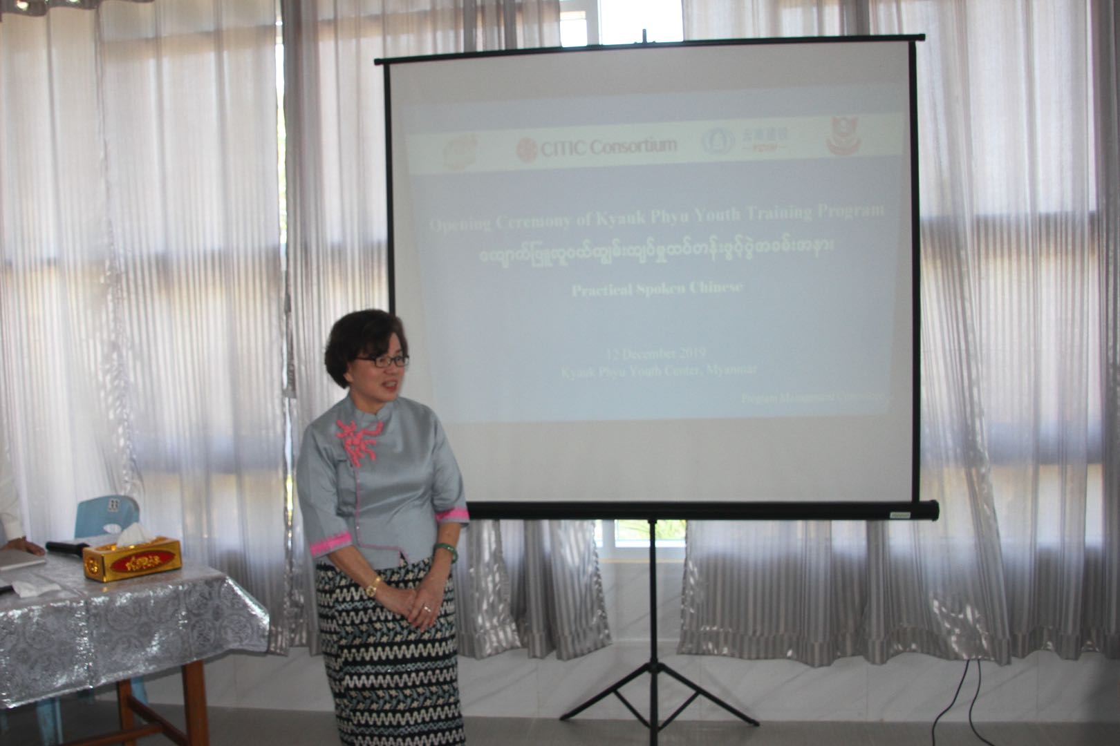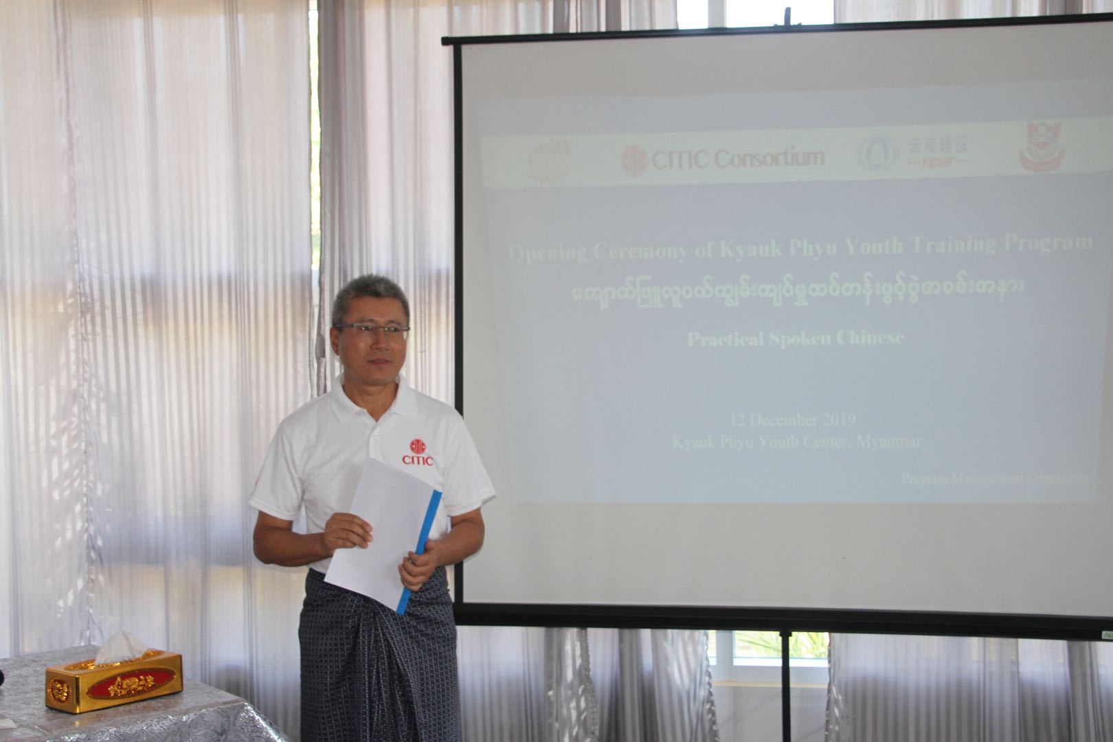20191212日,皎漂教学点首期中文培训班开学典礼在皎漂青少年中心举办。出席本次开班典礼的有缅甸东方孔子课堂院长曾圆香女士、中信集团(缅甸)有限责任公司副总经理马传福先生、中信联合体成员云南建投集团、缅甸民盟教育网络、培训管委会以及皎漂各界代表近百人。