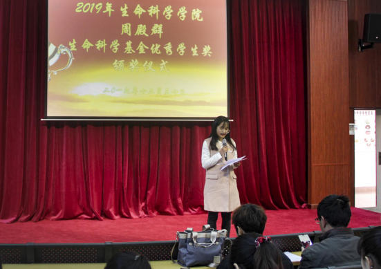 获奖学生代表2016级生物科学C班杨金润同学上台发表获奖感言,向周殿群先生以及学校、学院致以诚挚的谢意,感谢学院对生科学子的培养,感谢周殿群先生对生科学子的殷殷期许,并表示在今后的学习生活中将不负厚爱、锐意进取,为学院和学校的发展贡献力量。(生命科学学院 供稿)