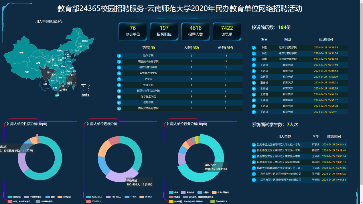 我校于427日举办教育部24365校园招聘服务-云南师范大学2020年民办教育单位网络招聘活动。本次参会单位共计76家,教育行业50家,其他行业26家,提供各类招聘职位197个,招聘4616人,投递简历184份。