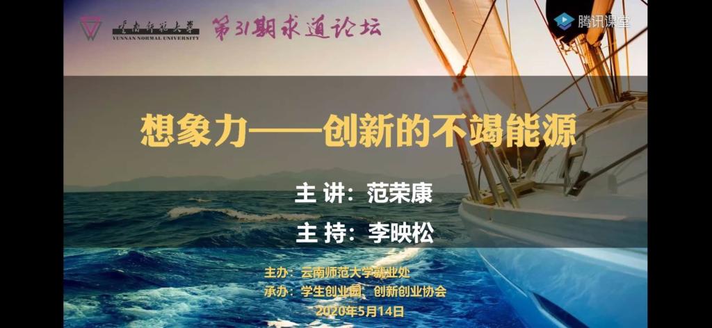 为认真贯彻落实学校疫情防控期间“停课不停教、不停学”的工作要求,由云南师范大学就业处主办,学生创业园、创新创业协会承办的第三十一期求道论坛于5月14日下午在腾讯课堂线上直播平台顺利进行,我校各学院(部)2500余名同学积极报名参加了线上讲座。
