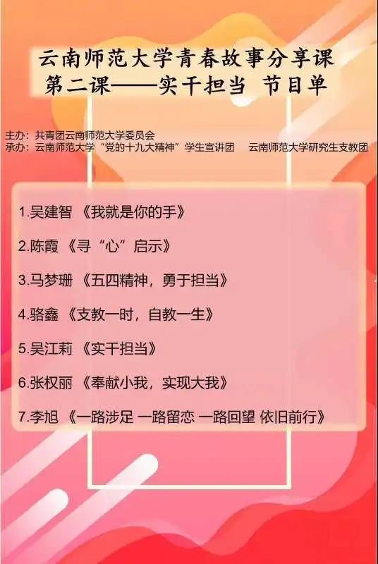 6月4日晚,校团委开展了第二期“奋斗的我,最美的国”社会实践活动,活动以实干担当为主题,邀请全国第七届道德模范,昭通学院学生吴建智,我校第五届研究生支教团团长骆鑫、第六届研究生支教团成员李旭、华文学院陈霞、教育学部马梦珊、文学院吴江莉和哲政学院张权丽7位同学担任分享嘉宾。以自己的切身经历和身边的真人真事为切入点,讲述青春故事,引领同学们深刻理解实干担当的意义,在担当中历练,在尽责中成长。