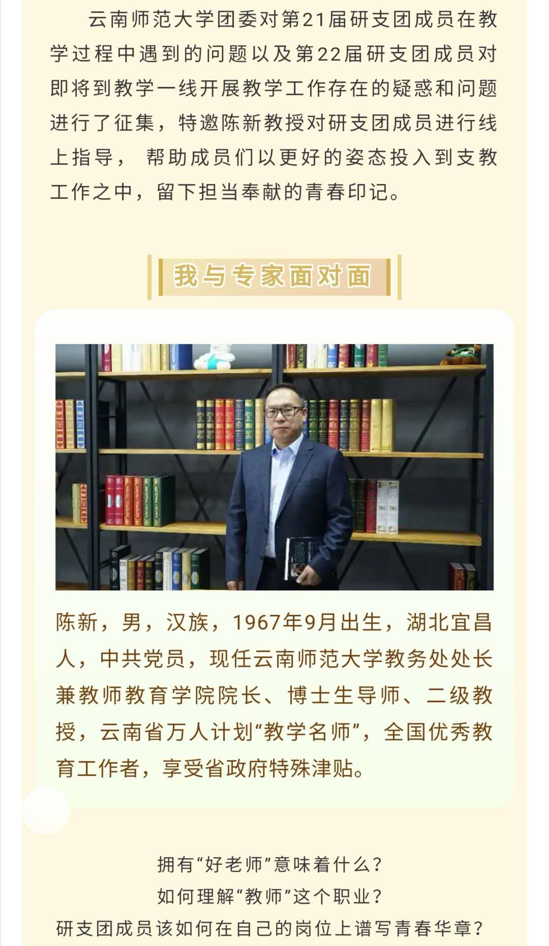 首期活动邀请到了全国优秀教育工作者,我校教务处处长兼教师教育学院院长,陈新教授作为分享嘉宾,为我校研究生支教团成员在支教过程中存在的疑惑和遇到的问题进行线上指导,帮助成员们以更好的姿态投入到支教工作之中,留下担当奉献的青春印记。