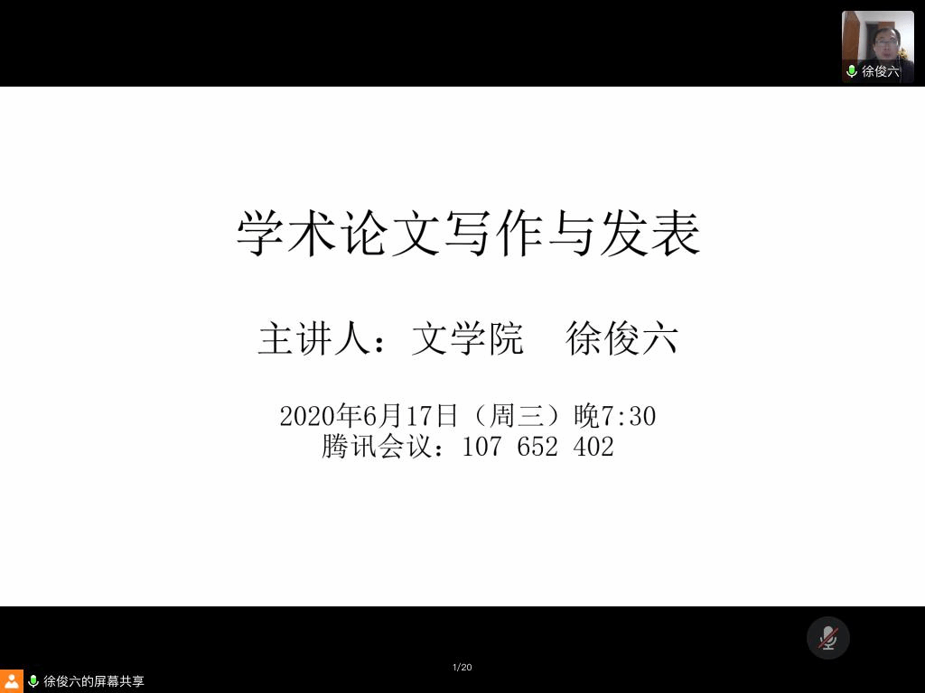 6月17日晚,文学院“研究生师生论坛”第十五期在腾讯会议线上直播平台举行。本次论坛邀请了文学院硕士研究生导师徐俊六老师,作了题为“学术论文写作与发表”的讲座。文学院近两百名学生参加了讲座。