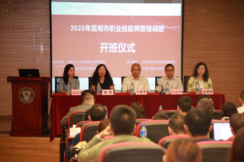 受昆明市人力资源和社会保障局和昆明市劳动就业局的委托,我校继续教育学院于8月24日至29日,协助云南泛海创业研究中心举办“昆明市2020职业技能师资培训”。8月25日上午,我校继续教育学院院长唐瑛、人社厅职业能力建设处副处长孔繁荣、昆明市劳动就业服务局局长万正文、昆明市人社局职业能力建设处处长张丽娟、昆明市劳动就业服务局副局长冯云波以及103位昆明市企业高技能人才、职业培训机构教师参加了开班仪式。