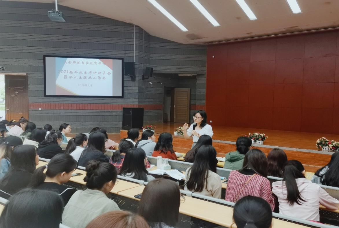 为进一步传达学校党委关于鼓励毕业生考研的通知精神,进一步做好2021届毕业生就业工作,教育学部于9月11日上午在汇文楼报告厅召开了2021届毕业生考研动员会暨就业工作会。教育学部学生工作办公室、教务办公室、研究生办公室、毕业班班主任以及2021届毕业生参加了会议。会议由教育学部党委副书记朱静虹主持。