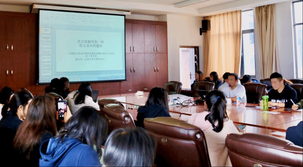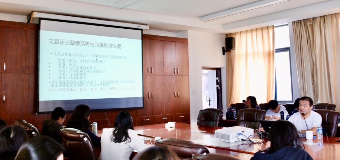 9月18日下午,北京大学外国语学院教授、博士生导师薄文泽教授应邀做客文学院“一多中文讲坛”第五十六期,在明德三号楼会议室作了题为“语言接触现象一例 语义成分的叠加——从海南文昌话长辈旁系男性亲属称谓看语言接触的一种方式”的语言学专题讲座。文学院、汉藏语研究院、华文学院的师生一同聆听了讲座,讲座由文学院副院长余金枝教授主持。