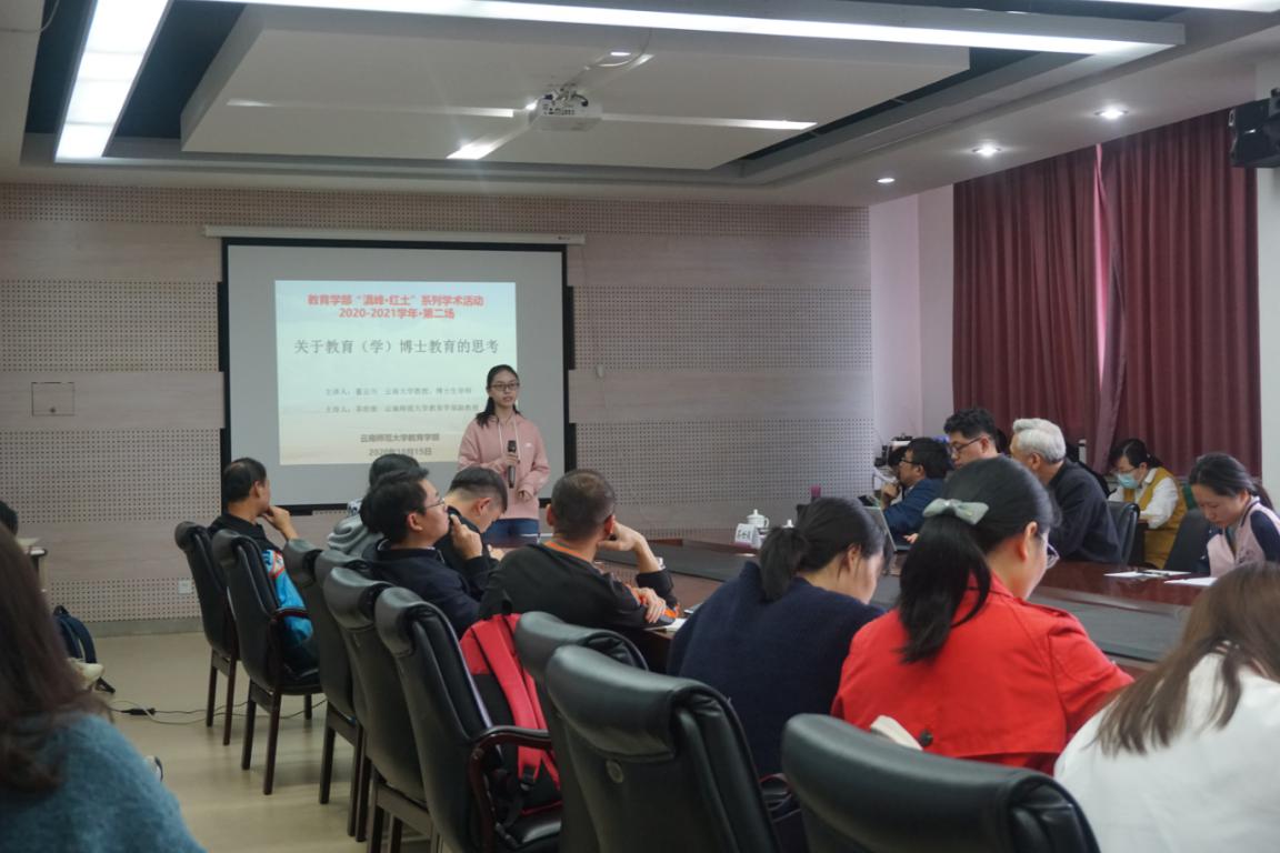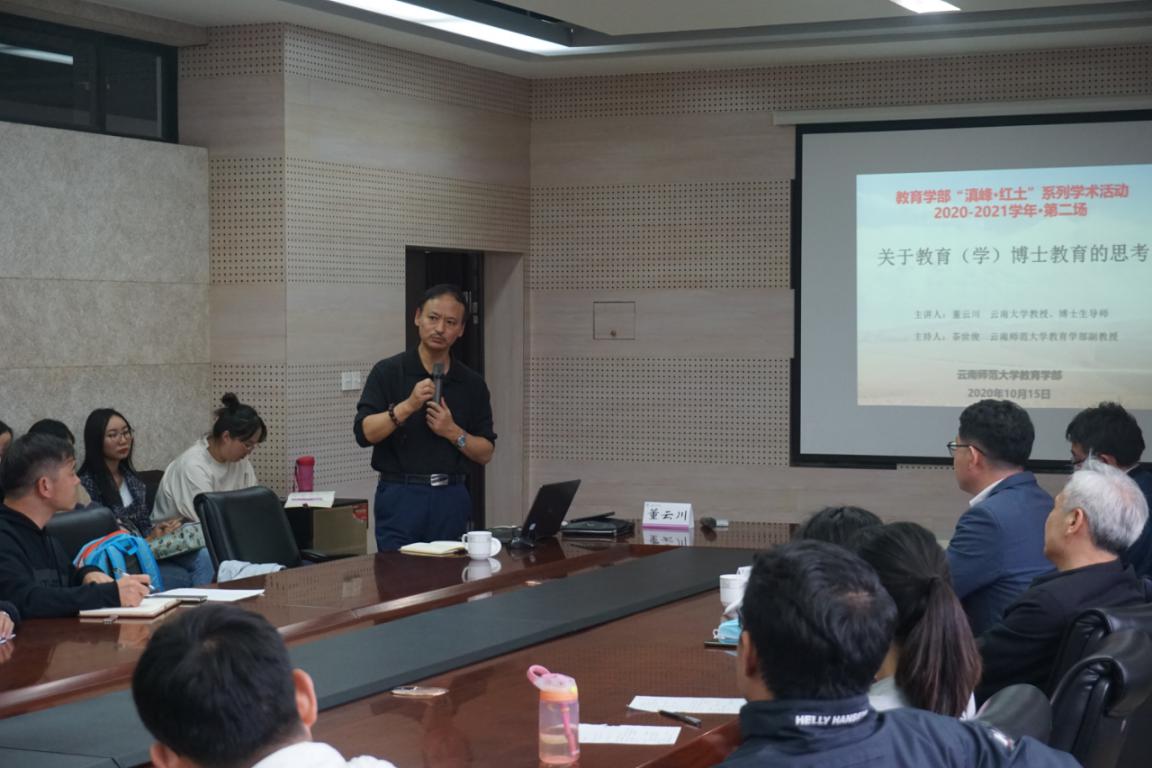 10月15日下午,“滇峰·红土”系列学术活动2020-2021学年第二场在明德4号楼322会议室举行。活动的主题是“关于教育(学)博士教育的思考”,特邀云南大学董云川教授对一年级博士生进行讲座指导。