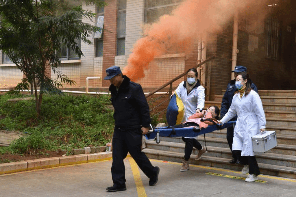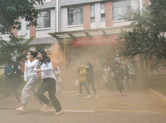 2020年11月9日中午,保卫处、校医院和后勤保障服务中心相关科室人员,各学院副书记、辅导员及1000余名学生在呈贡校区东区文聚2幢公寓和贝壳广场开展了学生公寓安全疏散和灭火演练。