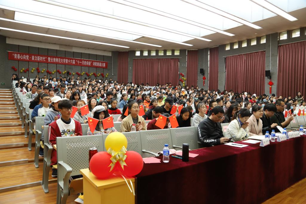 11月13日,云南师范大学“青春心向党 奋力新时代”第十六届“十一月的诗迹”诗歌朗诵大赛决赛在汇文楼3区105报告厅举行,比赛由学生工作部(处)主办,云南师范大学易班大学生工作站承办。校党委宣传部副部长伏云辉老师、校团委副书记赵彪老师、音乐舞蹈学院党委副书记杨进勐老师、传媒学院谭辉老师、对外合作交流处蒋晓涵老师担任本次比赛的评委,学生工作部(处)部、处长张国华老师、学生工作部(处)副部、处长李寿星老师以及来自各学院的500余名师生观看了比赛。