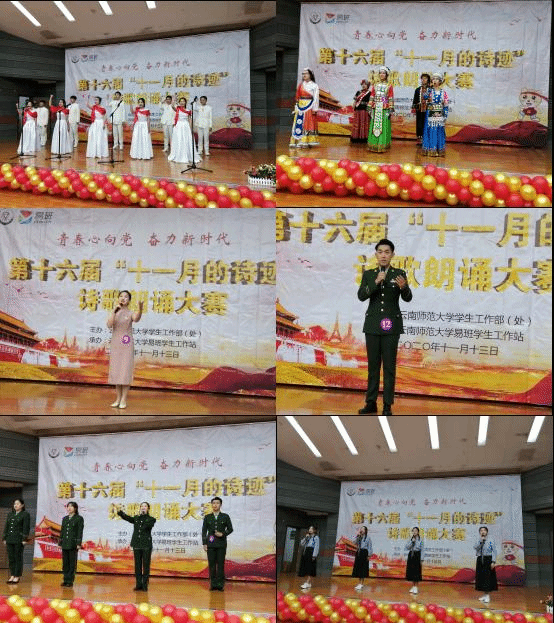 “十一月的诗迹”诗歌朗诵大赛至今已举办了十六届,大赛每年还向全校学生征集原创诗歌作品,并将优秀作品汇编成册。本次诗朗诵比赛激励了我校学生自觉把个人梦想同国家前途命运紧密结合起来,充分调动起广大青年学子爱国爱校、建功立业的情怀与斗志,展现了我校学子良好的精神风貌。