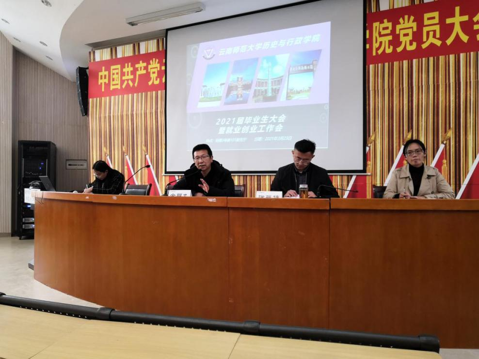 为深入贯彻落实党中央、国务院“稳就业”“保就业”决策部署,促进学院2021届毕业生更充分更高质量就业,3月23日下午,历史与行政学院在明德三号楼报告厅召开2021届毕业生大会暨就业创业工作会。学院2021届全体毕业本科生和研究生参加了动员会。学院党委书记余明九、党委副书记徐振坤、学工办主任金晓芳以及负责就业工作辅导员杨保维老师参加了动员大会,会议由杨保维老师主持。