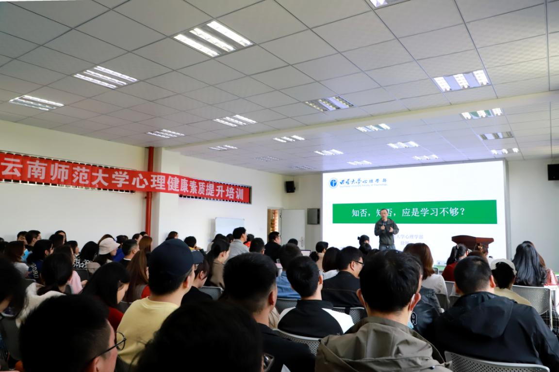 为深入贯彻落实《“健康中国2030”规划纲要》的要求,提高师生健康素养,深入开展“师生健康 中国健康”主题健康教育活动,4月7日下午,学校心理健康教育咨询中心特邀重庆心理学会教学委员会主任、西南大学心理学部徐展教授做题为《知否知否 应是学习不够》的专题讲座。本次讲座是由云南省学校心理健康教育师资培训与研究中心、云南省高校心理健康教育与咨询示范中心、云南师范大学心理健康教育咨询中心和云南师范大学应用心理专业硕士学位点联合开展,由心理健康教育咨询中心办公室主任尚云主持,心理健康教育咨询中心教师、各学院(部)心理辅导员、《大学生心理健康教育》课程教师团队、心理咨询员、心理协助员、应用心理学硕士研究生等近100人聆听了本次讲座。
