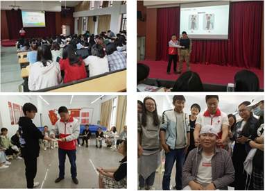本次活动有幸邀请到呈贡区红十字会急救培训中心的五位老师。活动主要分为两个流程。上午进行第一个流程,由呈贡区红十字会急救培训中心的耿老师为同学们讲解红十字精神及相应救护知识。耿老师在讲解过程中通过理论知识结合自己的亲身经历以及有趣的视频,让同学们在欢声笑语中学习到急救知识。下午进行第二项流程。首先,工作人员组织对参训学员上午所学的理论知识进行考核。之后,由红十字会急救培训中心的老师带领各小组进行基础急救处理方法演示和练习,让所有参与者对心肺复苏和简单的伤口包扎操作有了一定了解。