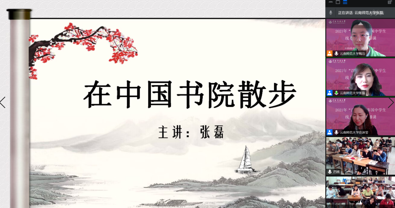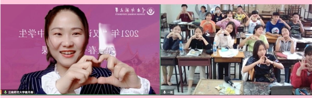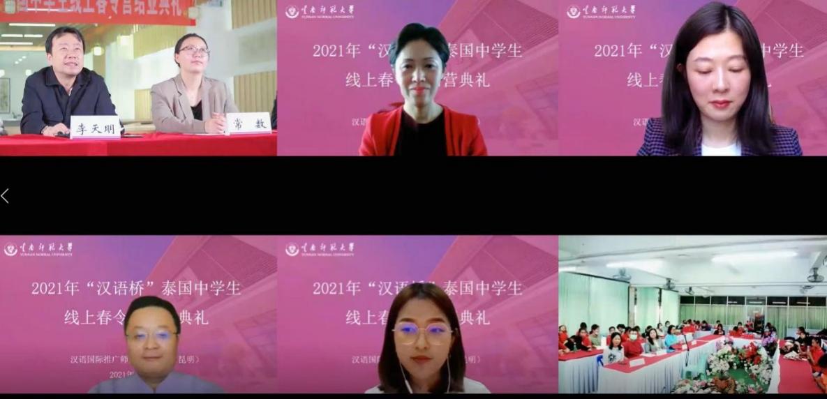 4月10日,国际汉语教育学院举办的2021“汉语桥”泰国中学生线上春令营在我校呈贡主校区同析2号楼、泰国拜县中学大礼堂和清迈大学孔子学院会议室举行结营典礼。国际汉语教育学院党委副书记常数、副院长李天明,拜县中学副校长金达女士,清迈大学孔子学院中方院长沈毅等多位领导出席,云南师范大学汉语国际推广师资培训基地(昆明)、学院留学生招生外事办公室、拜县中学教师代表以及线上春令营全体同学参加了典礼。