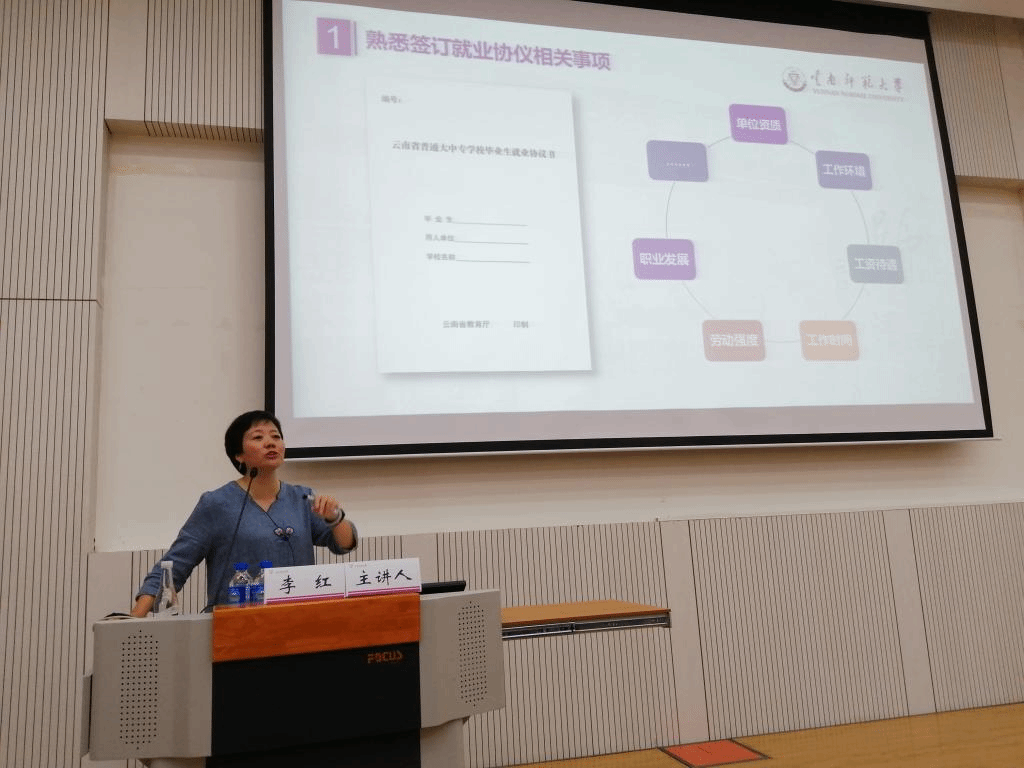 李红处长分析了近三年的云南省教师专项招聘、云南省属事业单位招聘、云南省特岗教师招聘和云南省公务员招录情况等,并围绕认清就业形势、调整就业心态、做好求职准备、用好就业政策、维护就业权益、创新创业等方面进行了讲座。李红处长用一个个鲜明的事例,让毕业生认识到严峻的就业形势,端正了就业态度,明确了就业目标和方向,为日后的职业发展打下良好基础。她还勉励广大毕业生要通过分析本专业近年来就业去向和就业趋势变化,通过分析就业地区分布、行业分布、职位分布以及工作满意度等内容,专业客观地作出正确的就业选择,积极调整心态就业创业。
