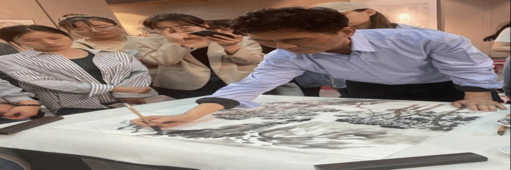 随后,阮荣春教授以“中国山水画创作与理论研讨”为主题,进行美育大讲堂首期讲授。他以人求学经历为切入点,讲解了中国传统山水画的当代发展,并与我校各学院师生代表进行深入的学术交流。他主张弘扬院体画风,提出的中国画要有静气、文气和正气的“三气”理论正是他本人创作秉持的原则。接着,阮荣春教授进行了现场创作交流并进行了山水画教学示范。