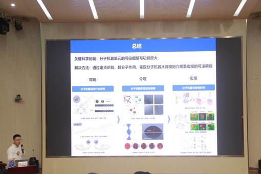 接着,陈家文教授为大家介绍了基于大位阻烯烃的光驱动分子马达,简述了其在可控分子运动、动态自组装和智能材料方面的研究与应用。他按照微观-介观-宏观的角度,详细介绍了人工合成分子机器从制备-控制它们运动-将功能放大推广应用的机理、方法和步骤。其中光驱动分子马达旋转的过程视频,如“跳舞的精灵”,让同学们震撼的同时也对陈家文教授团队的钻研精神感到敬佩。陈家文教授还给在场的同学们分享了自己国外求学的经历,他勉励在场的同学对待科研要有坚强的个性和独立的性格,去葆守自己的初心和坚定自己的信念。