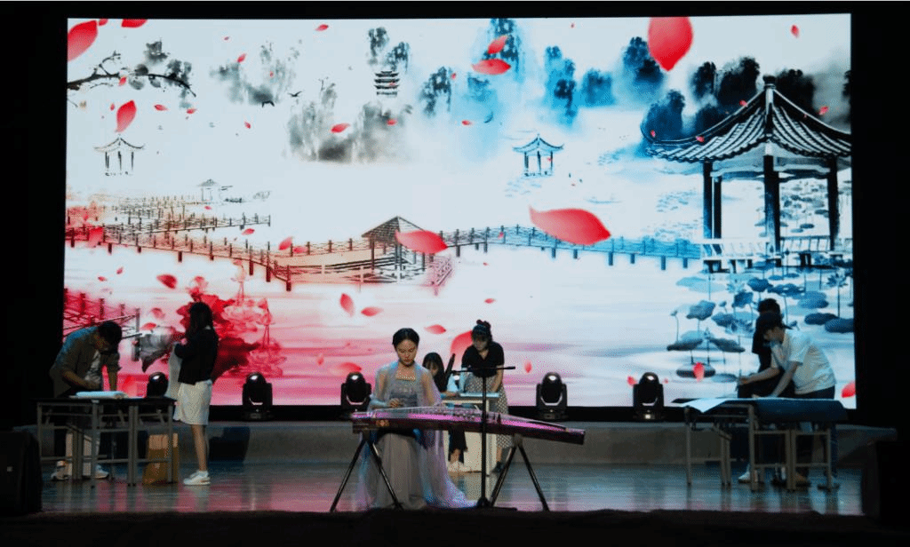 提问环节结束之后,同学们纷纷上台进行现场书法创作。与此同时,音乐舞蹈学院的杨代芝同学和黄顺同学分别表演了古筝独奏《寒鸦戏水》和笛子独奏《姑苏行》,将现场气氛推向了高潮,为大家带来一场书法与音乐的盛宴。