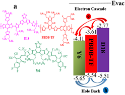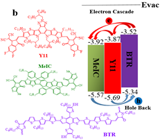 图1.给体(a)和受体(b)作为第三组分材料的器件能级结构和分子结构图。