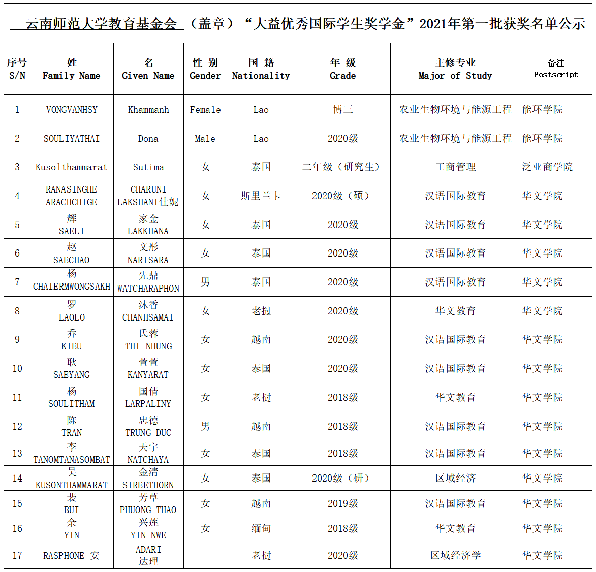 经各学院推荐,我校教育基金会办公室初审,大益爱心基金会终审,我校“大益优秀国际学生奖学金”2021年第一批获奖学生名单如下: