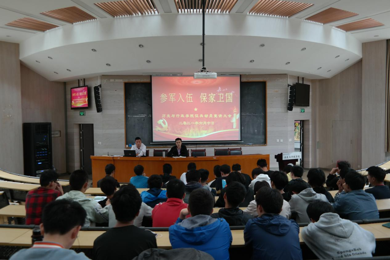 为鼓励青年学生积极参与应征入伍,提高兵员征集质量,推进国防和军队现代化建设,历史与行政学院于6月10日下午在明德三号楼报告厅举办了征兵动员宣讲会。学院邀请了2020级在读研究生宋海军宣讲,吸引了一百余名同学参加宣讲会,宣讲会由周鹏老师主持。