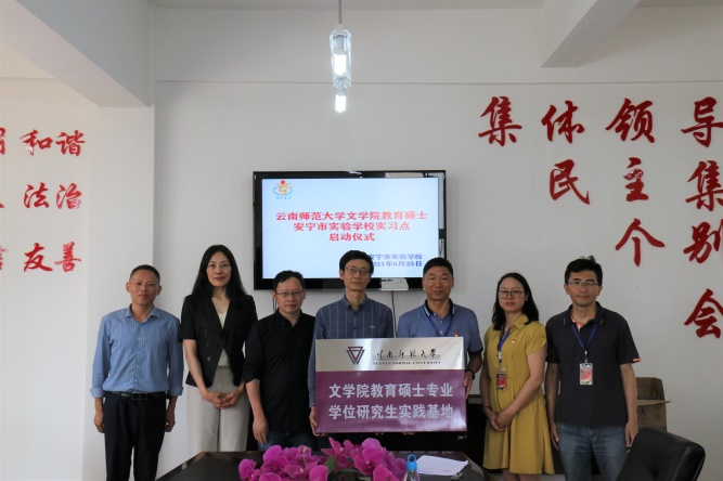 为认真落实教育部对全日制专业学位研究生的培养要求,更好地贯彻国家高等教育要服务于地方经济建设的战略决策,6月25日下午,“云南师范大学文学院与安宁市实验学校共建教育硕士专业学位研究生联合培养实践基地”挂牌仪式在安宁市实验学校四楼会议室举行。文学院李立院长、傅宇斌副院长、谭晓云教授,安宁市实验中学杜洪校长、李福连副校长、初中语文教研组长刘四平参加了此次挂牌仪式。
