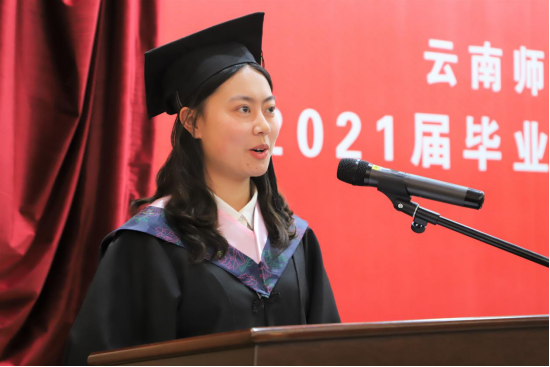 教师代表潘玉君教授为毕业生送上寄语。他饱含深情地说到,今年是他从教的第35年,地理学部历史悠久,同学们在地理学部刻苦学习、聆听教诲,涵养了高尚的情怀,掌握了为云南、为西南、为全国、为世界、为人类服务的真才实学。学部所有老师希望并且坚信大家会秉承西南联大师生“教书救国、读书报国”的精神,在将来的工作实践中取得更好的成绩,有更好的自我实现。