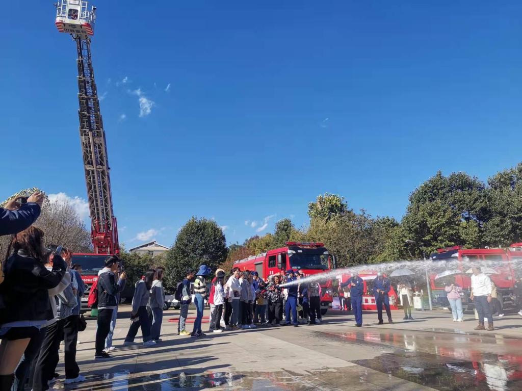 在消防员示范了在模拟火情发生时的逃生、灭火和高空救援等动作后,活动进入到消防应急救援实操阶段,现场参加体验的师生员工分成四组轮流进行穿戴防护服、实景灭火、火场逃生、高空救援实际操作演练。灭火器灭火实操是为了掌握快捷灭火的方法和技能,消防车灭火体验是为了让师生体验灭火过程中的协同和技巧,火场疏散逃生“体验屋”让参与者感受真实火场场景和到陌生地熟悉逃生通道的重要性,乘坐53米消防云梯车体验高层建筑火灾救援难度,穿戴防护服是体验消防员的艰辛付出和工作不易,消防应急救援车辆和其它装备器材展示了消防应急救援的专业和素养。整个活动气氛活跃,组织有序,安全圆满,