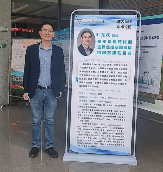 2021年11月29日,厦门大学叶龙武教授应邀参加了“联大高端学术论坛”,在化学化工学院报告厅作了“基于炔烃转化的选择性控制和杂环结构多样性合成”为题的学术讲座。本次讲座由化学化工学院院长陈业高教授主持,化学化工学院师生200余人参加了讲座。