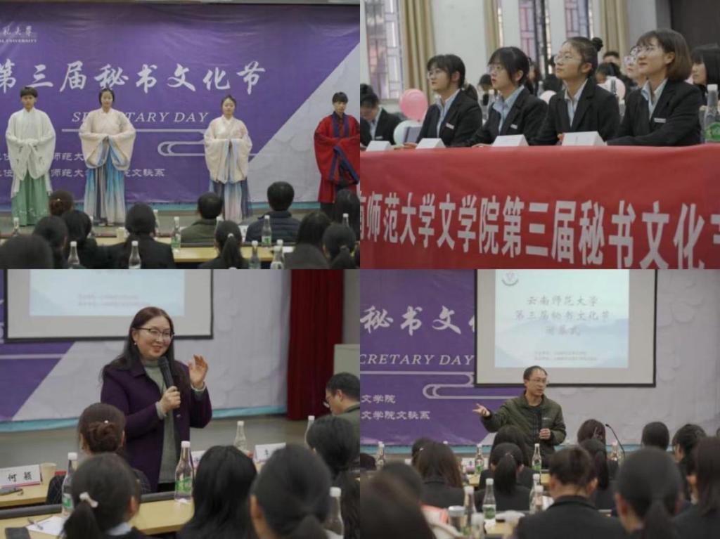12月9日上午,由徐俊六老师主持的秘书文化节开幕式在呈贡校区明德3号楼报告厅举行。文学院党委书记毛志荣致开幕词,文秘系系主任贾蔓、中文系系主任李瑛、文学院副院长杨吉华先后发表讲话,秘书学优秀学生代表朱晓燕同学作学习经验分享。