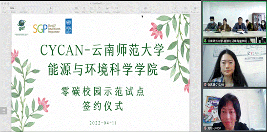4月11日上午,在联合国开发计划署全球环境小额赠款计划国家协调员刘怡的见证下,云南师范大学能源与环境科学学院与CYCAN举行了简单而隆重的零碳校园示范试点项目签约仪式,云南师范大学能源与环境科学学院院长徐锐和CYCAN秘书长张思璐出席并致辞。