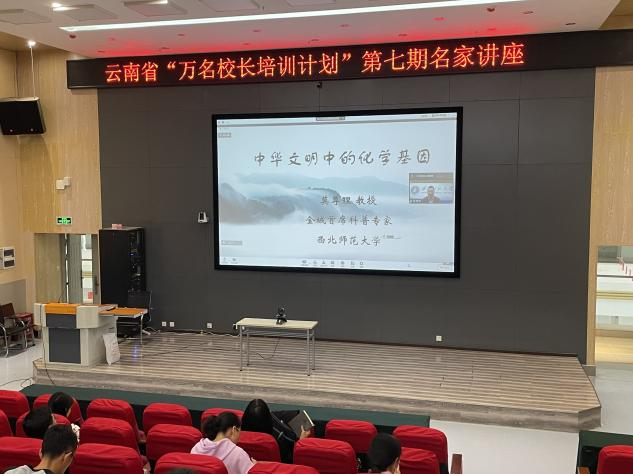 5月23日,云南省“万名校长培训计划”第七期“名家讲座”第二十八讲在我校呈贡主校区举行。西北师范大学二级教授、博士生导师、中国化学会理事、西北师大学术委员会副主任莫尊理作了题为《中华文明里的化学基因》的专题讲座。讲座由本期学员曲靖市麒麟区东山镇第一中学校长陈海所老师主持。