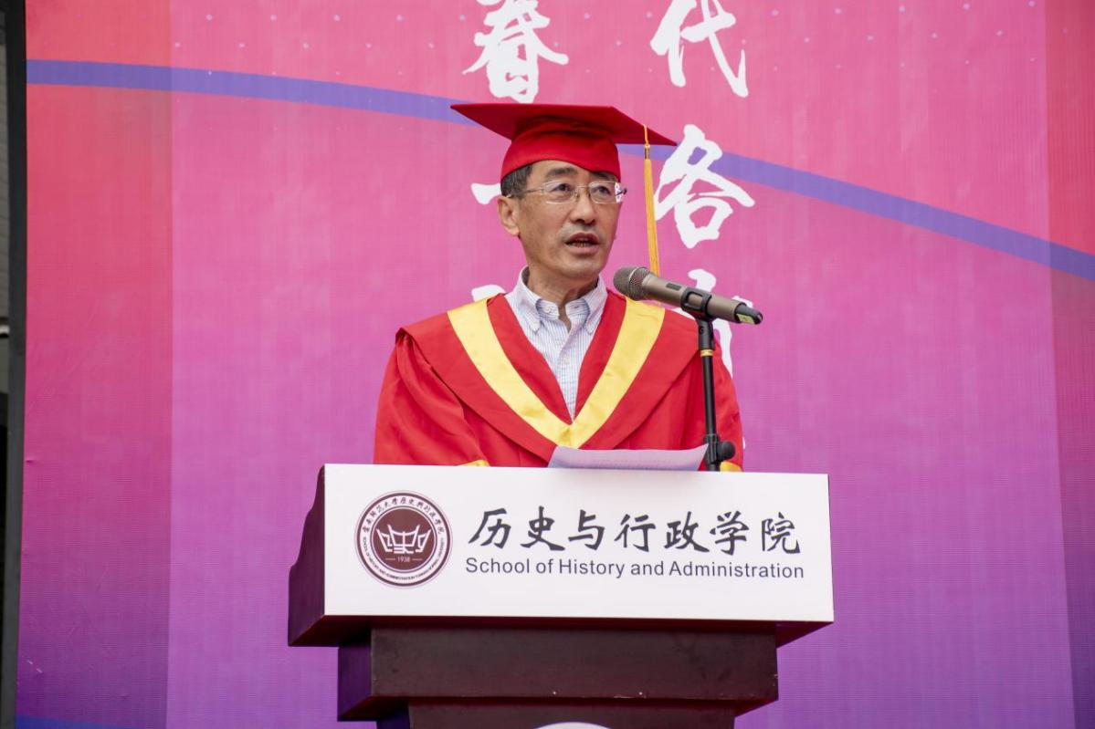 典礼伊始,全体起立,奏唱国歌。校党委副书记张玮致辞,他向历史与行政学院全体本科毕业生表示祝贺,向为同学们成长付出辛劳的学院全体教职工致以敬意,向同学们的父母家人表示感谢。临别之际,他希望同学们永远懂得刚毅坚卓、宽容豁达,不忘坚持学习、感恩回报,始终敢为人先、勇于超越。