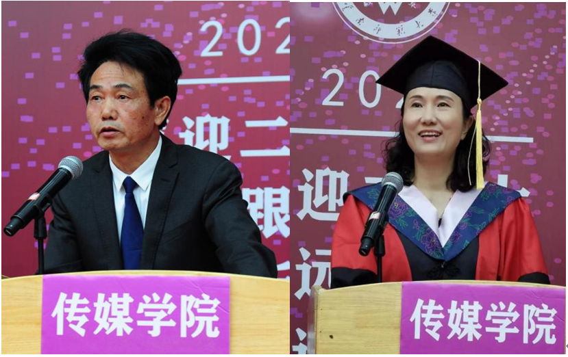 朱腾老师作为毕业班班主任代表发言,他深情寄语毕业生:“希望同学们以讲好中国故事为己任,向社会播撒传媒的力量,为学弟学妹们做好前进路上的榜样。”2018级新闻专业邓尚娟同学作为毕业生代表发言,2020级新闻与传播专业研究生柳佳明同学作为在校生代表发言,他们对学院老师的悉心教导表达感谢,表示了在新时代积极投身传媒事业,在新天地施展抱负、建功立业的决心。