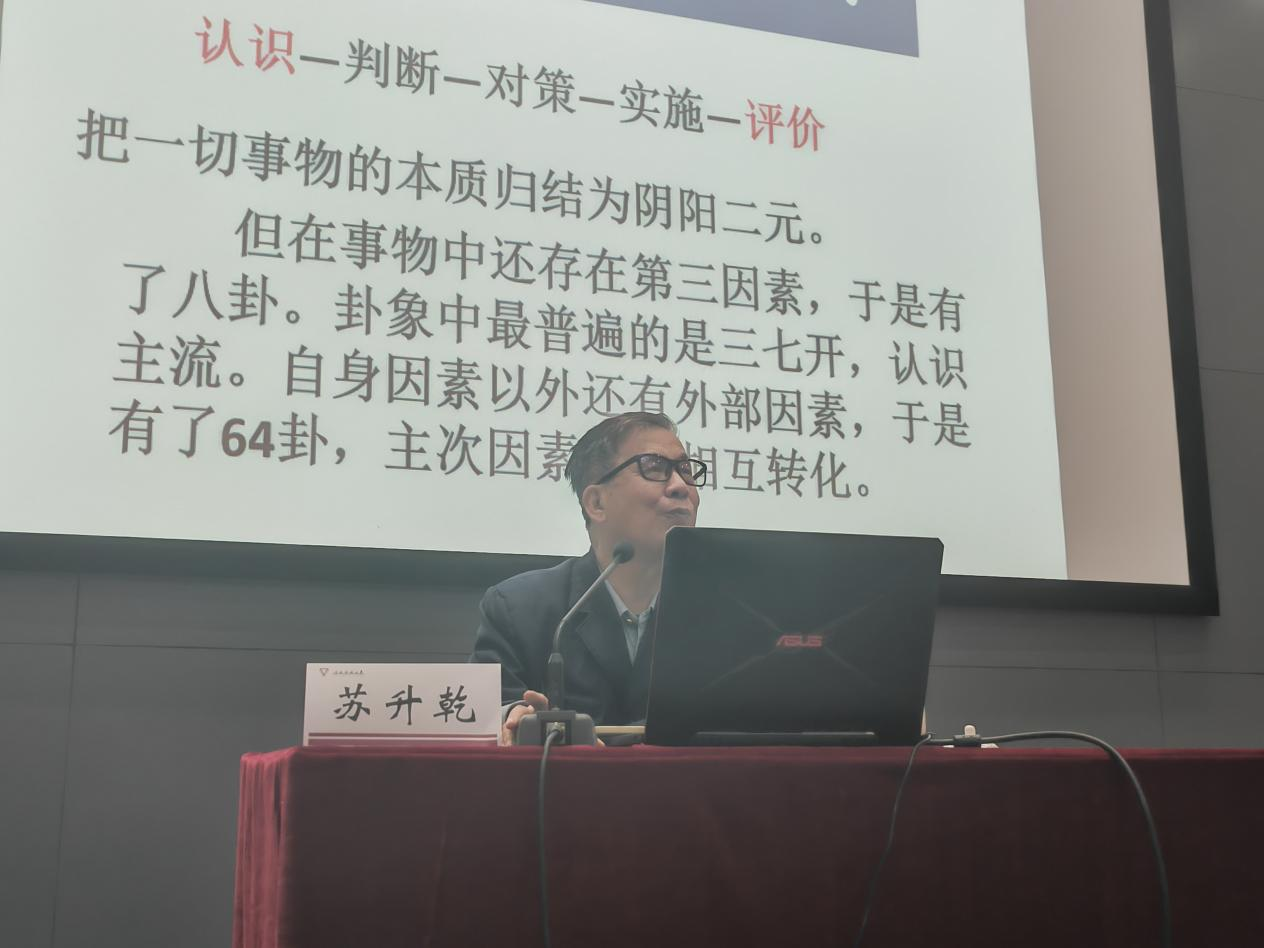 苏升乾将马克思主义基本原理与中华优秀传统文化的具体实践相结合,从中华传统文化的智慧渊源、奋进的人生态度、人生不利时求转化三个方面阐述了传统文化视野中人的发展。他结合儒、道、佛三种思想诠释了中国传统文化的核心,即注重整体、顾全大局、强调仁义、讲求忠孝、自强不息、兼济天下。同时,他指出了后天努力的重要性,“在人生道路上,勿蹉跎岁月,要自知时间宝贵”。苏升乾深度剖析了社会发展的规律,用独特的视角勉励学员坚守信念、不忘初心、知行合一,在平凡的岗位上创造不平凡的事业。