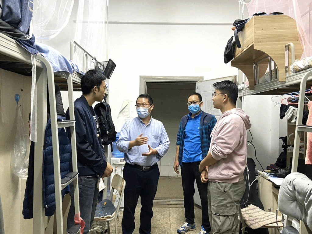 杨栋会和李富昌先后到西区10栋男生公寓和西区7栋女生公寓,每到一处都与同学们亲切交谈,深入了解校园疫情管理期间同学们的思想动态、心理状况、学习生活情况,倾听同学们心声,嘱托同学们要做好个人防护,理解支持学校学院疫情防控政策的用心和苦心,严格遵守疫情防控管理要求。鼓励同学们珍惜在校学习时光,夯实专业基础,提高自身理论水平,做好未来职业规划,立大志、明大德、成大才、担大任。