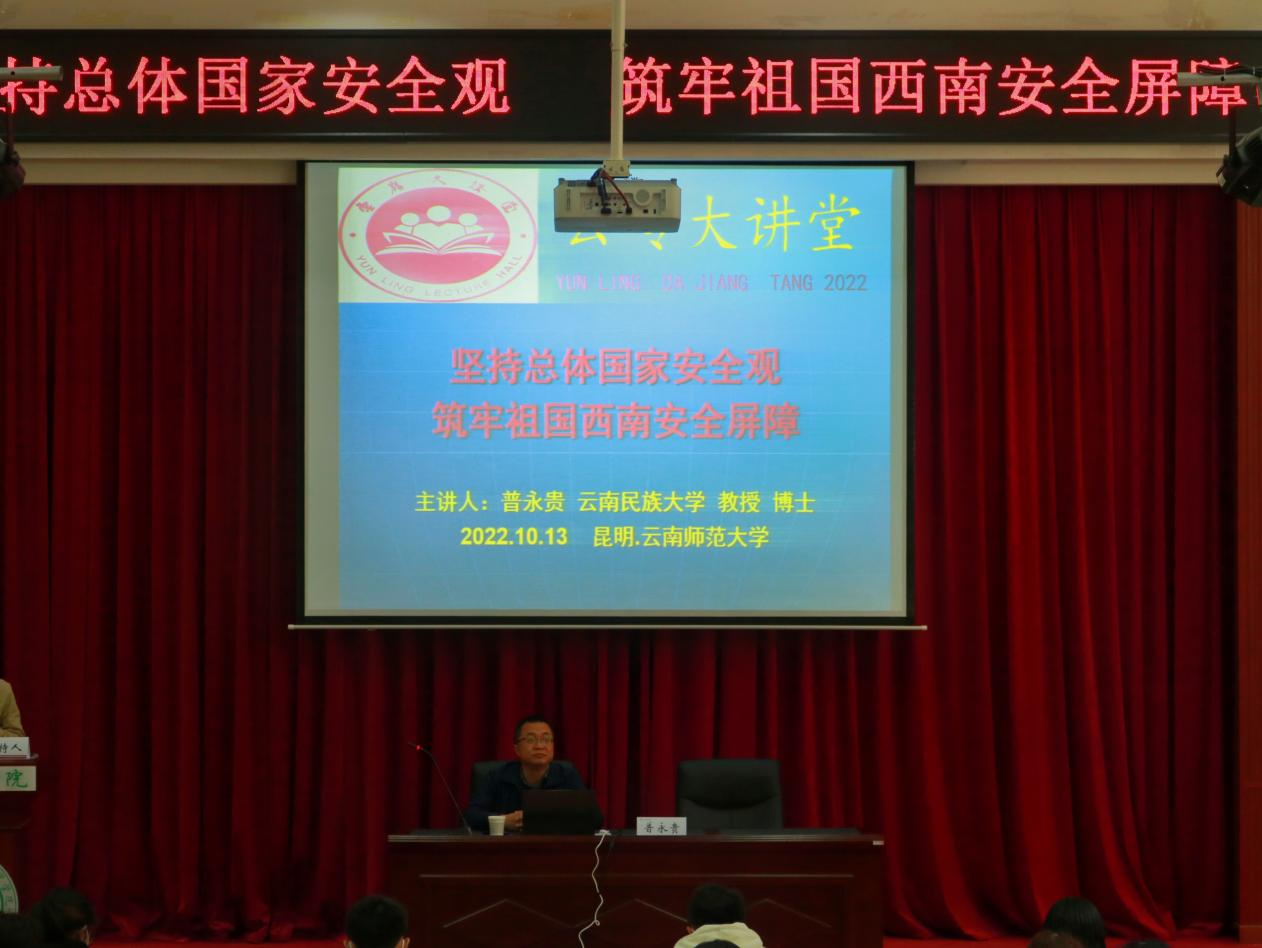 10月13日下午,2022年“云岭大讲堂•云南师大讲坛”第6讲在呈贡校区睿智3号楼106报告厅开讲。云南民族大学普永贵教授以“坚持总体国家安全观,筑牢祖国西南安全屏障”为题作了专题讲座。我校150余名师生参加讲座。讲座由生命与科学学院副院长周峻沛主持。