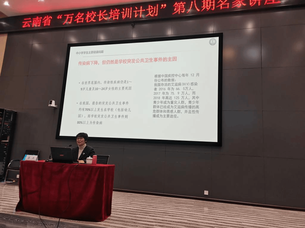 10月19日,云南省“万名校长培训计划”第八期“名家讲座”第十八讲在我校呈贡校区举行。昆明医科大学二级教授、博士生导师、教育部公共卫生与预防医学教学指导委员会委员、中华医学会医学教育委员会委员、云南省预防医学会副理事长李燕作了题为《校园健康,我们该做些什么》的专题讲座。