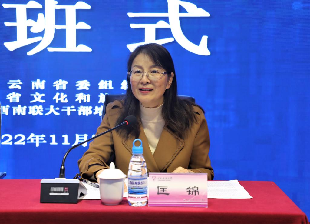 匡锦在欢迎致辞中介绍了云南师范大学和云南西南联大干部培训基地的基本情况。她表示,云南西南联大干部培训基地将充分发挥西南联大红色文化资源育人优势,认真落实省委组织部、省文旅厅的工作要求,从课程设置、专家遴选、方式方法、组织实施、服务保障等方面为高质量举办好培训班提供坚实保障。希望全体学员提高站位,严守疫情防控各项规定和学习纪律要求,专心学习,互学互鉴,把思想和认识统一到党的二十大精神上来,推动全省文旅融合高质量发展。