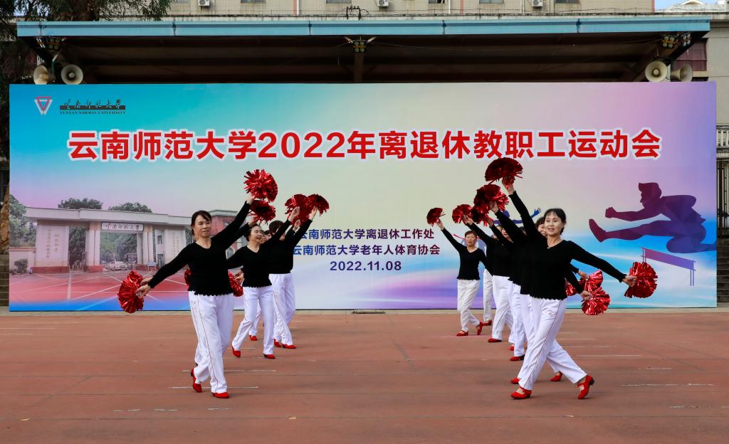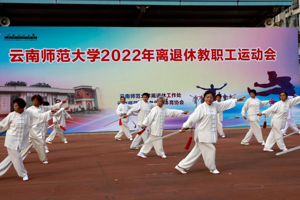 11月8日上午,离退休工作处与云南师范大学老年人体育协会联合举办的云南师范大学2022年离退休教职工运动会在一二一西南联大校区田径场举行。运动会开幕式上,老同志们欣赏了由云南师大老年大学师生们带来的太极剑、健身操、手指舞及柔力球的表演。云南师范大学老体协主席陈志青致辞,并宣布运动会开幕。