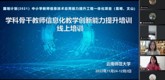 11月24日上午,由云南师范大学统筹和承担的云南省2021年中小学幼儿园教师国家级培训计划——中小学教师信息技术应用能力提升工程一体化项目三——“学科骨干教师信息化教学创新能力提升培训线上培训”项目开班仪式在腾讯会议、云南师范大学非学历培训平台举行。