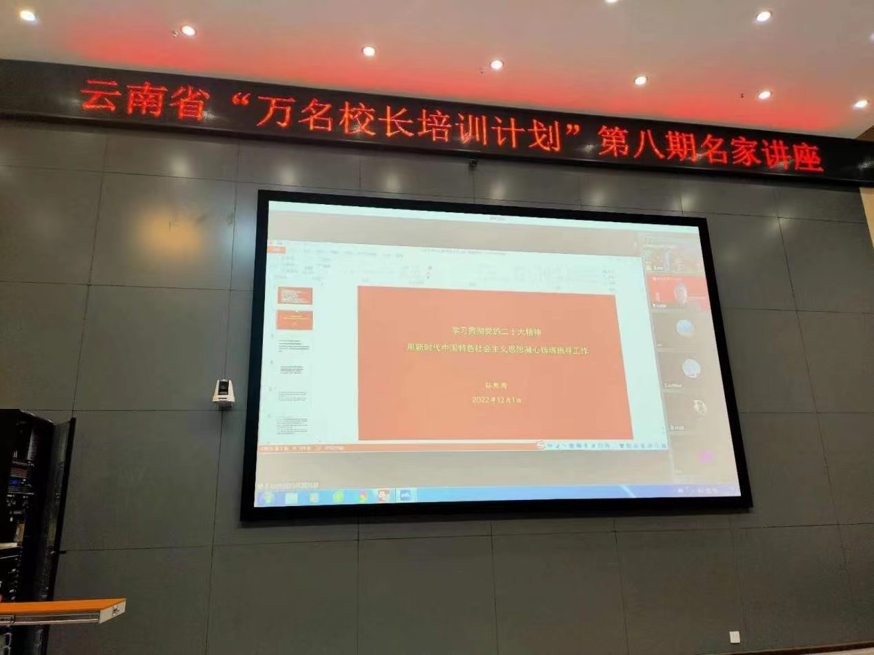 12月1日,云南省“万名校长培训计划”第八期“名家讲座”第三十二讲在我校呈贡主校区举行。北京大学马克思主义学院教授、博士生导师孙熙国作了《学习贯彻党的二十大精神:用习近平新时代中国特色社会主义思想凝心铸魂指导工作》专题讲座。